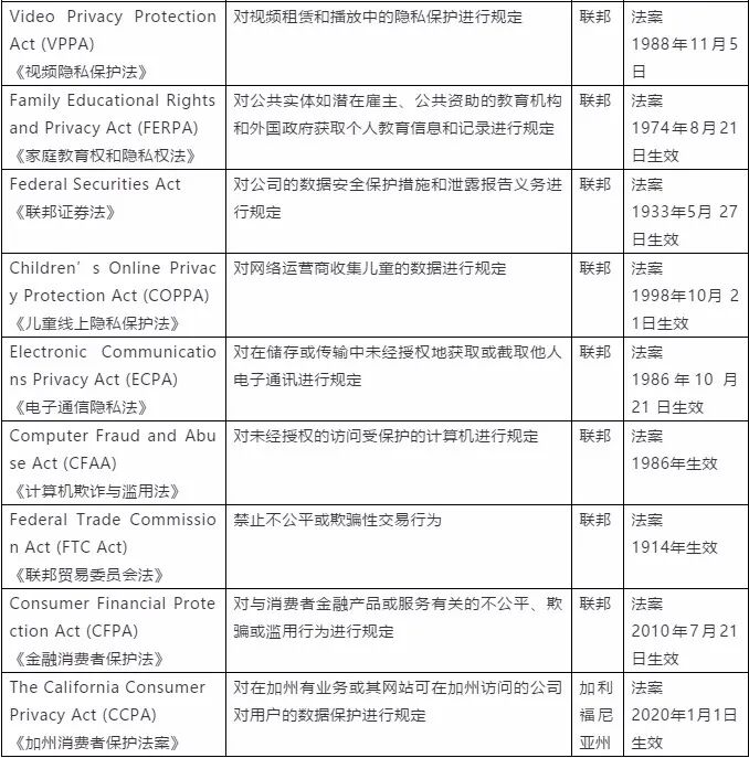 中国数据相关主要立法有《民法典》(将于2021年1月1日施行)、《刑法修正案(九)》、最高人民法院和最高人民检察院《关于办理侵犯公民个人信息刑事案件适用法律若干问题的解释》、《网络安全法》、工信部《电信和互联网用户个人信息保护规定》、《全国人大常委会关于加强网络信息保护的决定》、信安标委《信息安全技术个人信息安全规范》(GB/T35273-2020,将于10月1日生效)等。