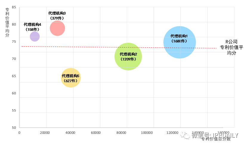 另外,除了对专利申请各阶段进行质量管控以外,筛选优质代理机构委托代理也是非常重要的。如何筛选优质代理机构呢?笔者认为应从其代理专利的质和量两个维度综合评定。具体而言对不同代理机构代理案件的专利数量、专利价值总分数、专利价值平均分三个维度进行分析。例如R公司委托的五家代理机构中,代理数量及专利价值总分数最高的是代理机构1和代理机构2,代理质量高于R公司专利平均水平的是代理机构3、代理机构4、代理机构1,可见从代理专利的质和量两个维度评价,代理机构1是最优秀的代理机构。