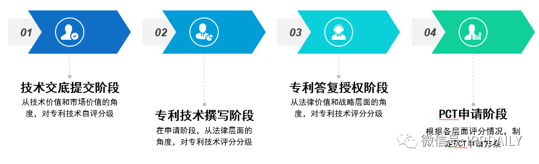 对专利申请各阶段实施评价分级,把控质量,以确保专利权的顺利取得和权利保护范围的合理性。首先在技术交底提交阶段,从技术价值及市场价值的角度对专利技术自评分级;在专利技术撰写阶段,从法律层面对专利技术评分分级;在专利答复授权阶段,从法律价值和战略价值对专利技术评分分级;在PCT申请阶段,需综合考虑技术、市场等维度综合考虑确定是否进行PCT申请以及进入的国家等。