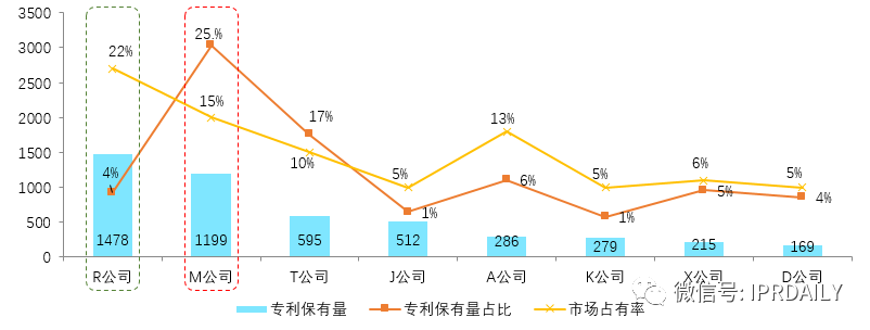 例如考量R公司是否需要针对电梯业务增补专利,可针对电梯领域的各个竞争对手从专利保有量、专利保有率、市场占有率三个维度进行分析。通过分析发现R公司专利保有量最多,高达为1478件,如果仅从保有量出发可以判断该公司专利储备十分充足,无需增补专利,但是结合市场占有率来看,该公司市场份额高达22%,而专利保有量占比仅为4%,专利保有量占比与市场占有率差距很大。相反竞争对手M公司市场占有率为15%,而专利保有量占比竟高达25%,并且T公司等其他竞争对手的专利保有量占比与市场占有率差距也不大,足以说明R公司亟需针对电梯业务增补专利,加固霸主之位。