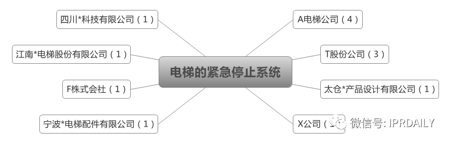 例如为了寻找R公司专利运营的对象,首先筛选R公司的高被引专利,针对高被引专利的引用主体进行梳理。从下图可见 R公司“电梯的紧急停止系统”这件专利被引用次数很高,并且被A电梯公司、T公司引用频繁,由此可判断A电梯公司、T公司与R公司的技术联系紧密,可作为潜在的专利运营对象进行深入考察。