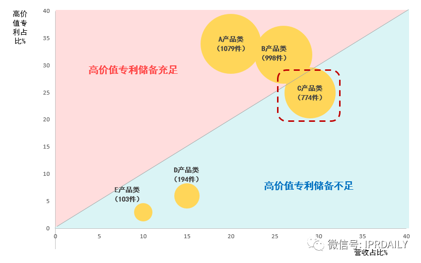 例如R公司共有A产品、B产品等六大业务板块,从营收占比可见A产品、B产品和C产品营收占比较高,为R公司的核心业务,从专利保有量及高价值专利储备量来看,相对于A产品和B产品,C产品的专利保有量及高价值专利储备量相对不足,所以在经费吃紧的情况下应优先针对C产品增补专利储备。
