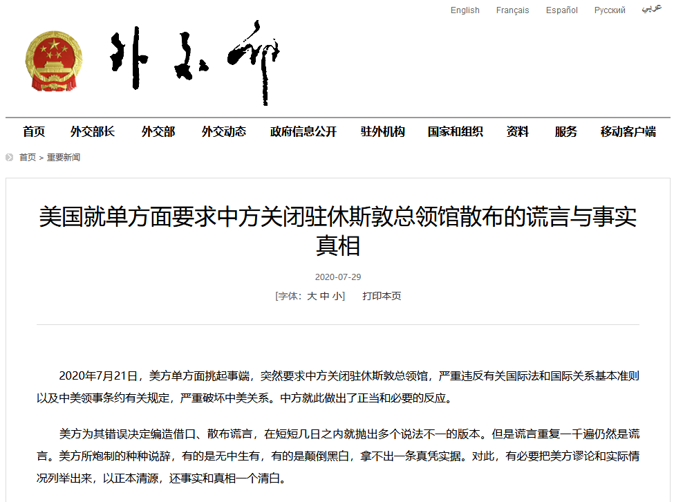 2020年7月21日,美方单方面挑起事端,突然要求中方关闭驻休斯敦总领馆,严重违反有关国际法和国际关系基本准则以及中美领事条约有关规定,严重破坏中美关系。中方就此做出了正当和必要的反应。