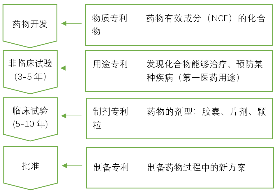 制剂专利涉及药物的剂型(胶囊、片剂、颗粒等)。制剂专利需要考虑到最终制药时的稳定性、有效成分的吸收、安全性等,多在临床试验阶段申请(药物研发后5至10年左右)。