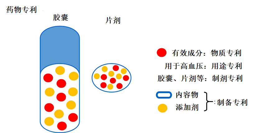 药物专利大致可以分为如下四种:物质专利、用途专利、制剂专利以及制备专利。
