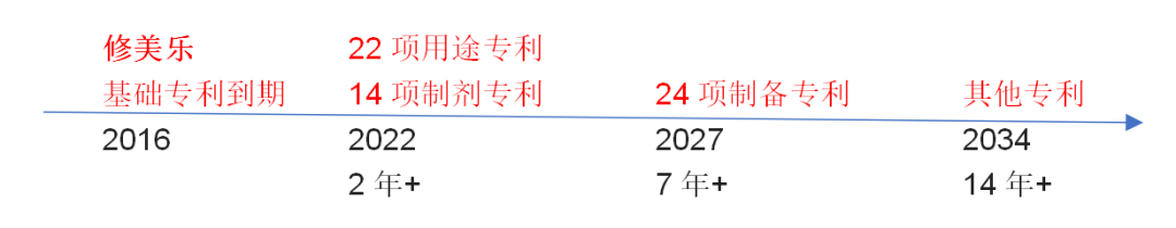 修美乐的基础专利于2016年到期,但是美国至今仍未出现修美乐的仿制药。针对这款重磅销售炸弹,艾伯维公司一直在不遗余力地用专利保护修美乐。实际上,艾伯维公司利用至少包括22项用途专利、14项制剂专利、24项制备专利以及15项其他专利的专利丛林,使得修美乐的专利保护最长可以延长到2034年。