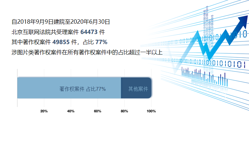 自2018年9月9日建院至2020年6月30日,我院共受理案件64473件,其中著作权案件49855件,占比77%,涉图片类著作权案件在所有著作权案件中的占比超过一半以上,总体上呈现以下主要特点: