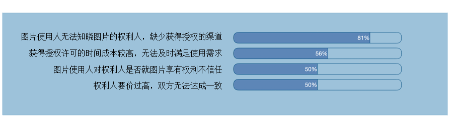 但问卷调查同时显示,图片使用人事先获得授权存在诸多困难,主要体现在:一是图片使用人无法知晓图片的权利人,缺少获得授权的渠道;二是获得授权许可的时间成本较高,无法及时满足使用需求;三是图片使用人对权利人是否就图片享有权利不信任;四是权利人要价过高,双方无法达成一致。图片使用人认为存在上述困难的比例分别为81.25%、56.25%、50%、50%,事先无法知晓权利主体这一原因更为突出。