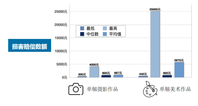 绝大部分案件中,原被告均未针对如何确定损害赔偿进行举证,法院判决多使用法定赔偿的方式确定损害赔偿数额。实践中,损害赔偿数额的裁判标准体现出差异化和梯度化。目前,单幅摄影作品的最低损害赔偿额为300元,最高为4000元,中位数为800元,平均值为867元;单幅美术作品的最低损害赔偿额为440元,最高为25000元,中位数为800元,平均值为5670元。针对损害赔偿的问卷调查结果差异较大,63%的图片使用人认为单幅图片的损害赔偿金额低于200元是合理的;而51%的权利人则认为单幅图片判决2000元以上是合理的。