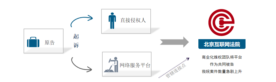 互联网法院的建立,极大降低了诉讼的时间、经济等成本,提升了诉讼维权的便利性。北京的互联网企业集中,网络服务平台众多,因此一些商业化维权团队通过在这些平台上主动寻找侵权行为,并将平台作为共同被告的方式在我院起诉,导致案件数量急剧上升。