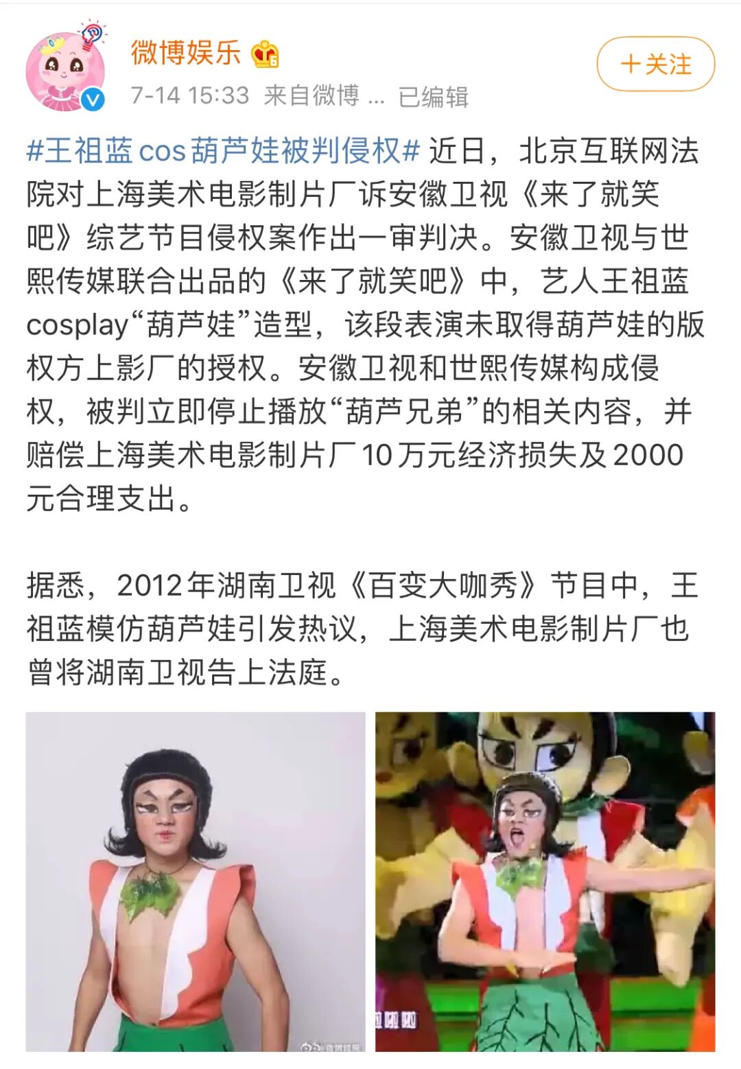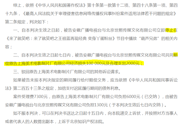 王祖蓝cos葫芦娃被判侵权,赔偿上影厂10万元,附一审判决书