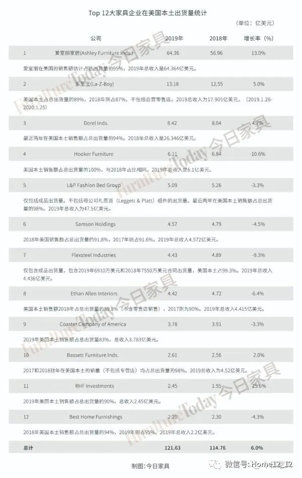 美国TOP12家具企业总出货量121亿美元,最高增长达25%
