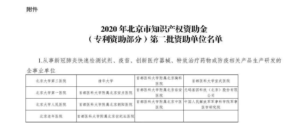 2020年北京市知识产权资助金(专利资助部分)第二批资助单位名单公示