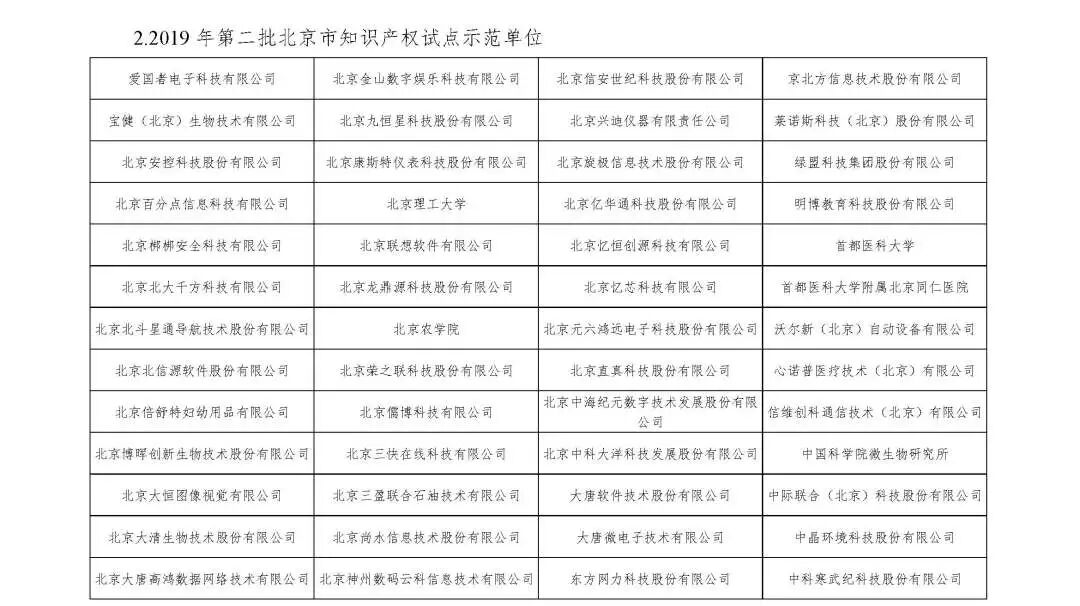 2020年北京市知识产权资助金(专利资助部分)第二批资助单位名单