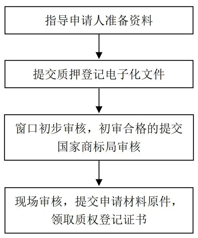 1.窗口提交申请材料原件。经审核,申请登记书件齐备、符合规定的,国家知识产权局予以受理并登记,通知申请人在申请受理窗口递交纸质申请材料原件(必须与扫描电子件完全一致)并领取商标专用权质权登记证,受理、登记办理时限压缩至 2 个工作日,一次办结。