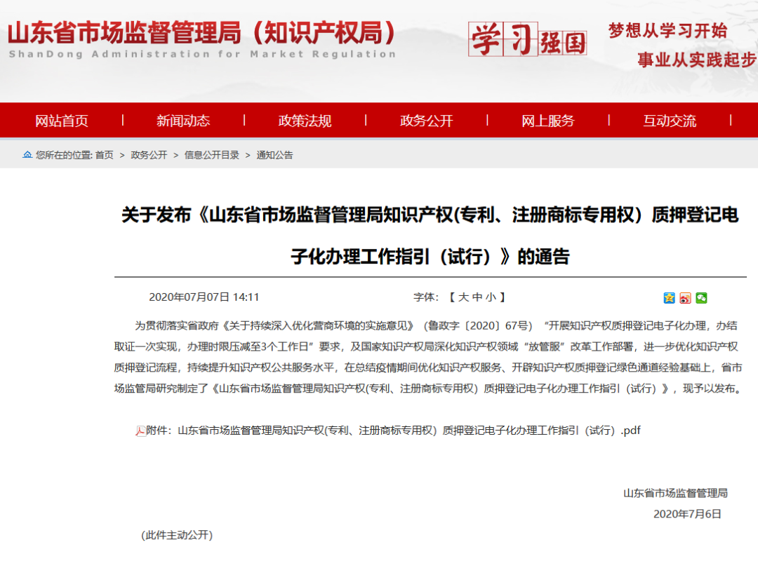 关于发布《山东省市场监督管理局知识产权(专利、注册商标专用权)质押登记电子化办理工作指引(试行)》的通告