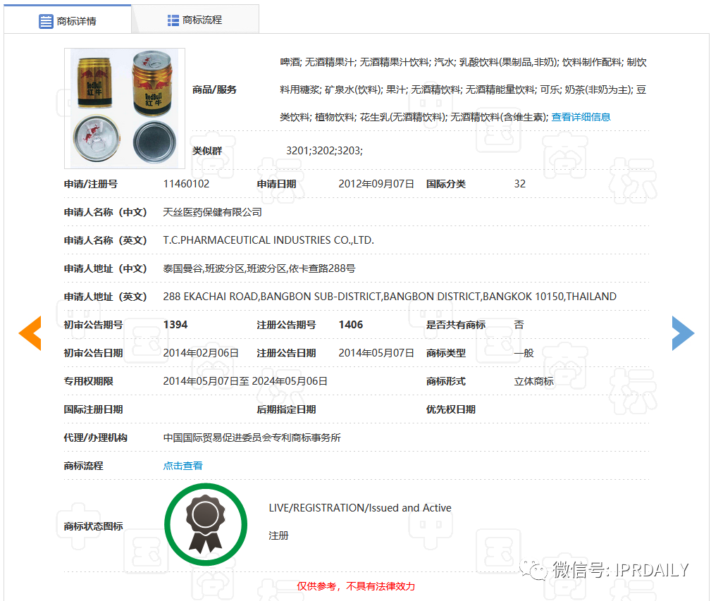 据中国商标网显示,此次的争议商标由天丝医药于2012年9月7日申请,2014年5月7日核准注册,商标专用期至2024年5月6日。从商标图的显示来看,此立体商标就是红牛的金罐包装。