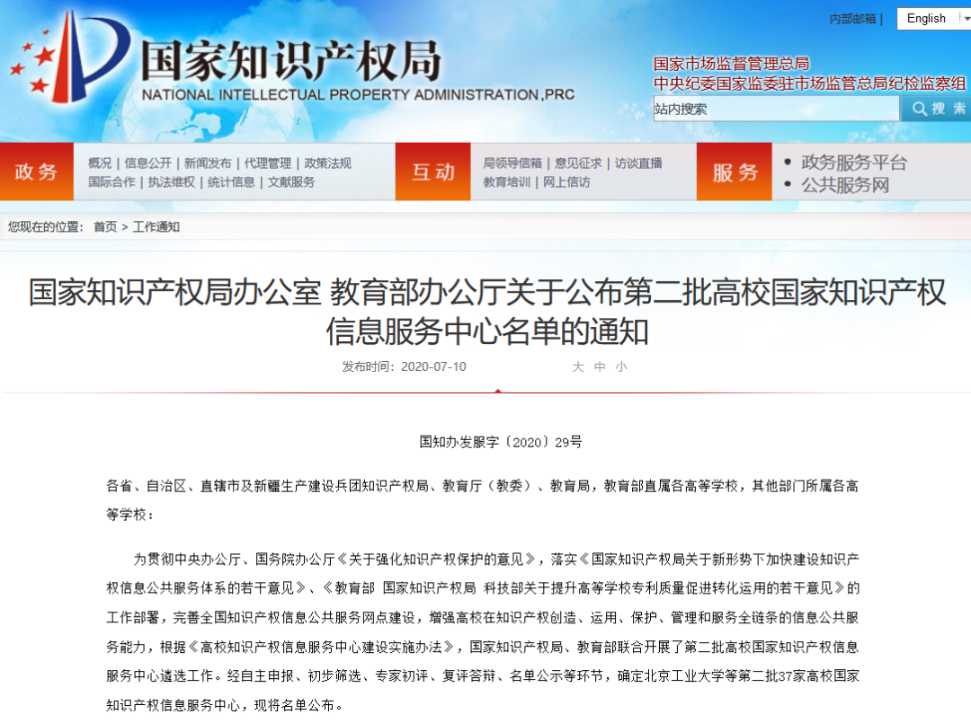 原标题:国家知识产权局办公室 教育部办公厅关于公布第二批高校国家知识产权信息服务中心名单的通知 导读:近日,国家知识产权局办公室 教育部办公厅关于公布第二批高校国家知识产权信息服务中心名单的通知。通知指出,国家知识产权局、教育部联合开展了第二批高校国家知识产权信息服务中心遴选工作。经自主申报、初步筛选、专家初评、复评答辩、名单公示等环节,确定北京工业大学等第二批37家高校国家知识产权信息服务中心,现将名单公布。
