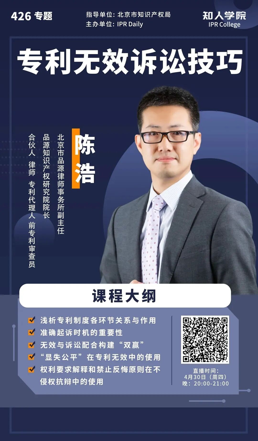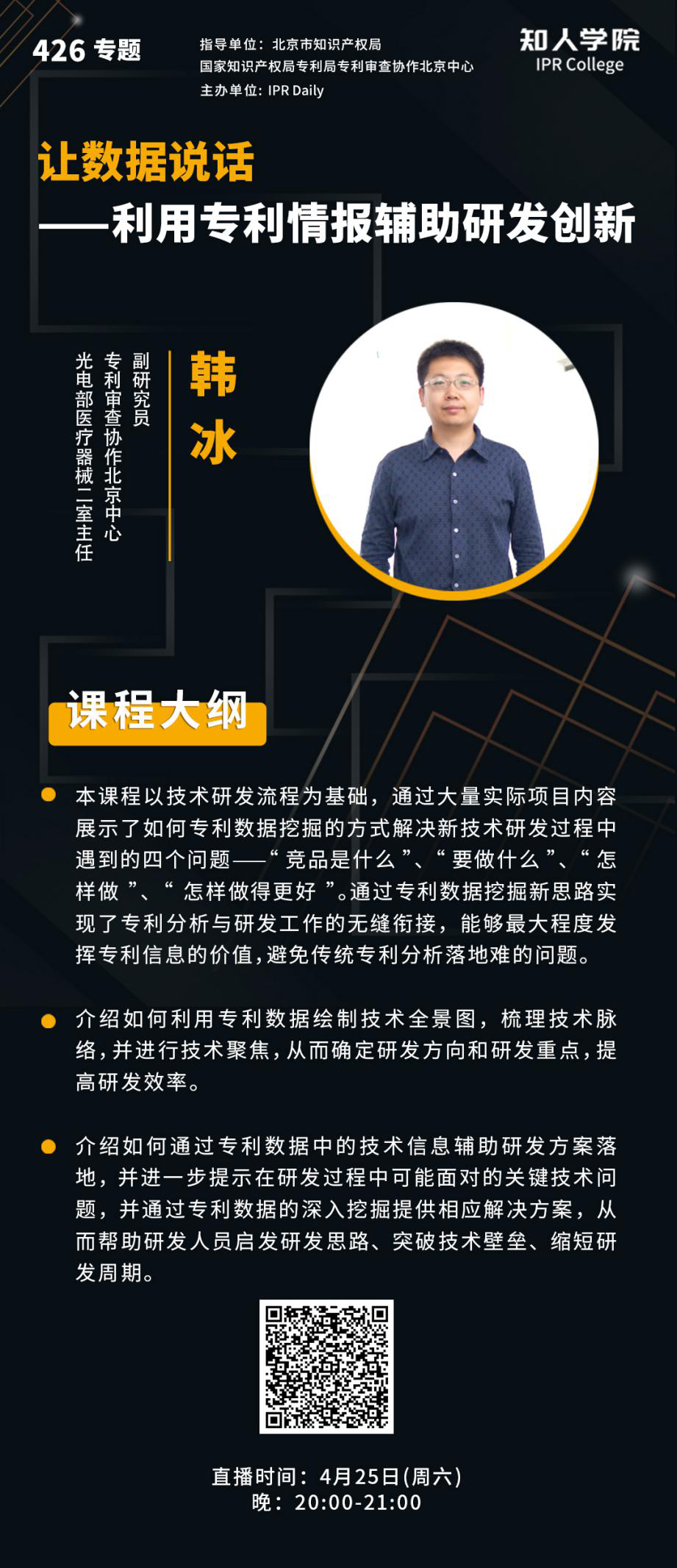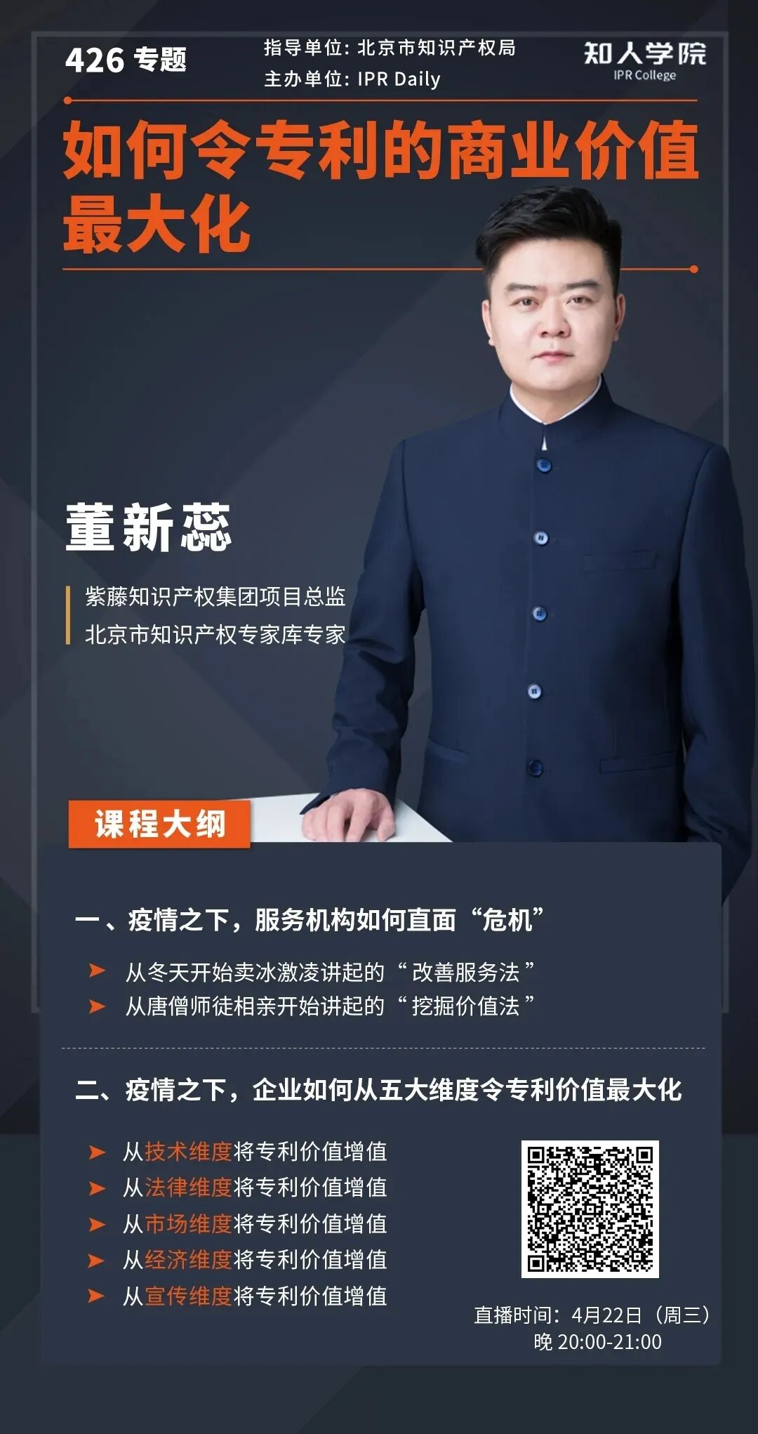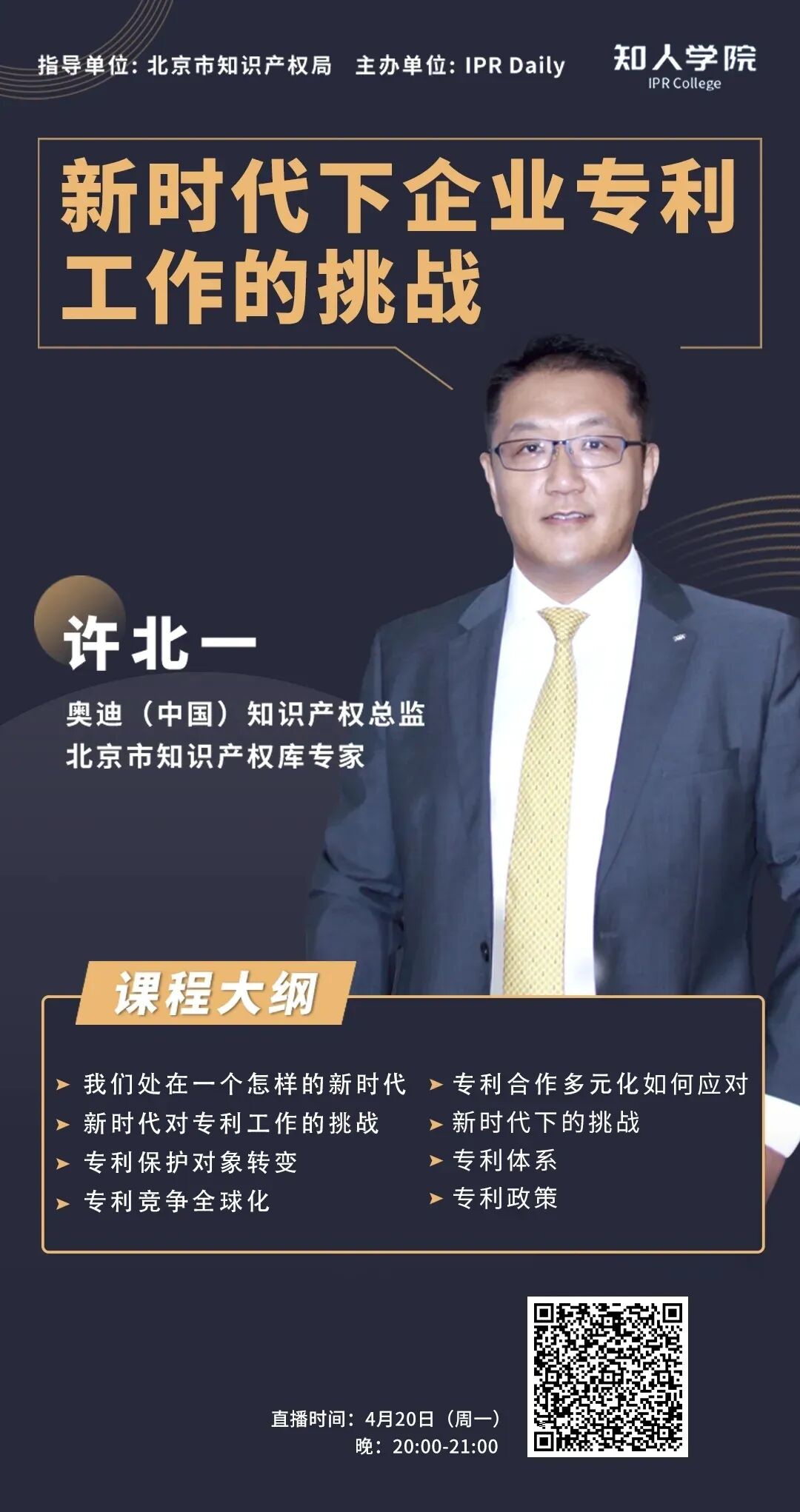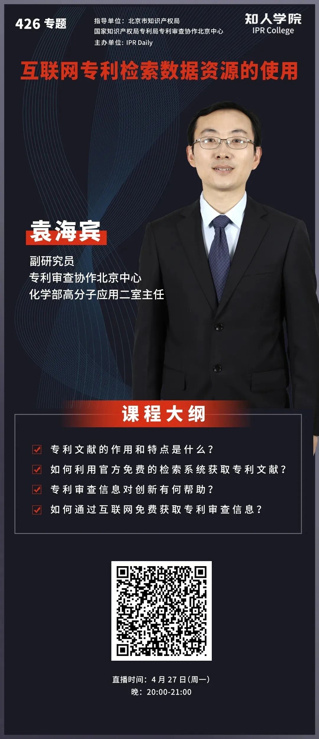 2019年,北京市知识产权局启动知识产权专家库建设,汇聚了一批业内知名、志愿为北京知识产权事业服务的专家。为进一步发挥专家特长,帮助北京创新主体提升知识产权的实务能力,北京市知识产权局和IPRDaily于2020年“4·26”期间共同推出“知识产权专家云讲堂”活动,邀请专家通过网络直播的形式讲授知识产权实务知识。
