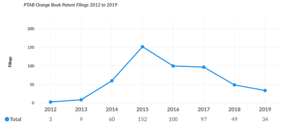 图6. 2012 至2019 年PTAB 针对橙皮书专利的无效请求量