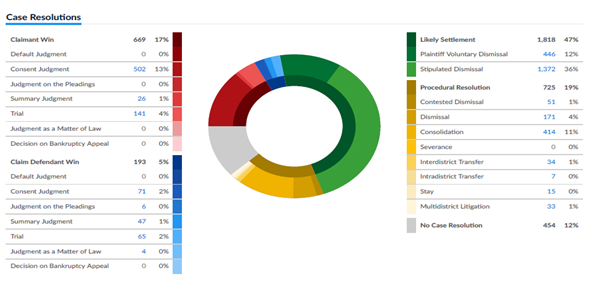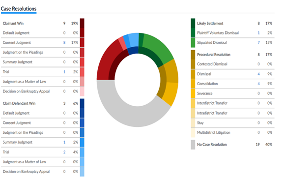 在案件进展方面,2010-2019年这十年间,ANDA案件的案件进展及结案情况如图3所示。从数据整体来看,47%的案件以可能和解的方式结案。“可能和解”包括原告自愿撤诉和协议撤诉,通常(但非一定)是基于双方的和解。但是, ANDA案件的可能和解率远远低于整体的专利案件可能和解率(参见《2019年LEX MACHINA专利诉讼报告》)。