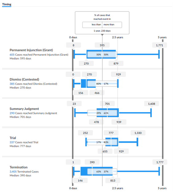 图4进一步显示了ANDA案件到达“里程碑”事件的时间。这些里程碑事件包括永久禁令(permanent injunction)、撤诉(dismiss)、简易判决(summary judgement)、庭审(trial)、终结(termination)等。基于对案件的统计分析,以箱型图的方式显示这些事件。具体而言,根据Lex Machina采用的规则,“中位数”位于箱体中间的分割线,对数据点进行均匀分割,使得分割线两边各有 50% 的数据点。而“箱体界限”箱体包含了位于50% 的数据点(从第 25 个百分位数到第 75 个百分位数),这使得该箱体能够很好地表示出预期的合理范围。压缩的箱体意味着更多的数据点落入较小的时间范围内,因此时间的一致性更高;相反,较长的箱体预示着数据点分布在较宽的时间段内,因此更加不可预测。