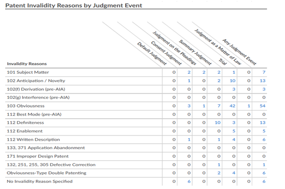 在ANDA诉讼中,专利无效理由如下(图5)。由图5可见,主要理由为显而易见性(obviousness,35 USC §103),其次是缺乏新颖性(anticipation / novelty,35 USC §102)等。