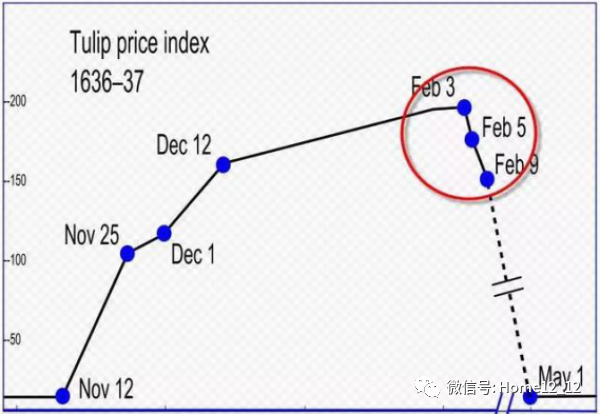 当年,整个荷兰都在疯狂买卖郁金香球茎,高级品种价格抵得上一座豪宅。1637年1月,1颗普通品质的球茎价格为60荷兰盾,到了2月份就涨到1600荷兰盾(当时荷兰人年收入大概是150荷兰盾)。人们以为郁金香的价格会永远涨下去,但并没有。2月已是最高峰,几周后价格已是原来的1%,甚至更低。
