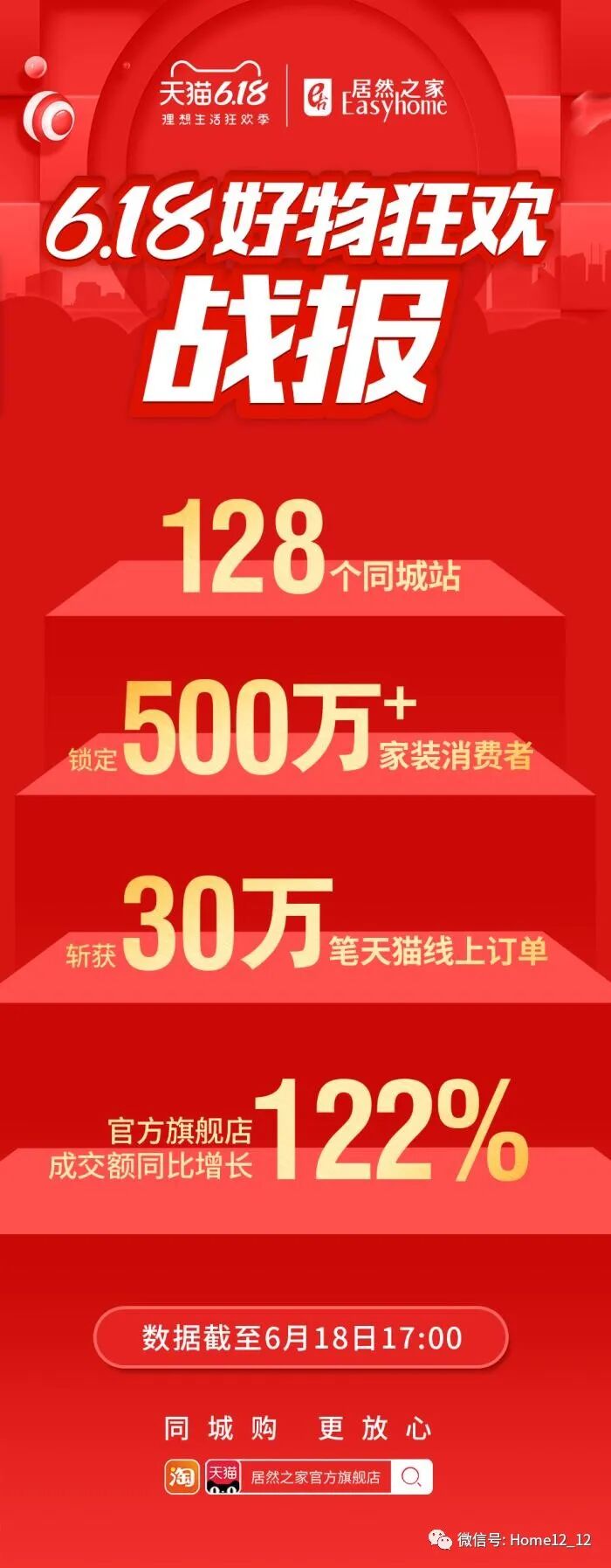 刚刚,居然之家公布“6·18理想生活狂欢季”截至6月18日17:00的销售数据,今年,居然之家6·18活动线上共计128个同城站参与,共锁定超500万+家装用户,斩获30万笔天猫线上订单,天猫官方旗舰店成交额同比增长122%。