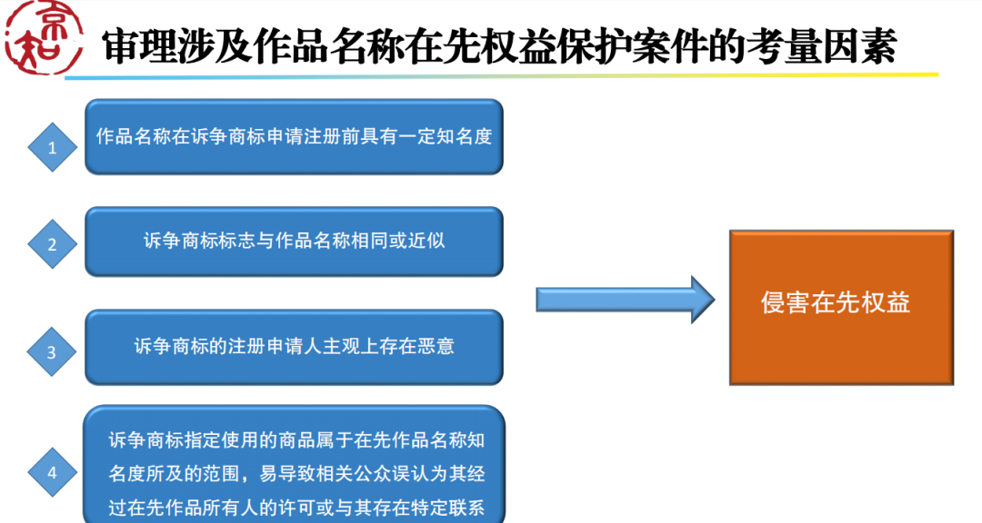 在北京知识产权法院审理的商标授权确权行政案件中,部分当事人根据上述法律规定、司法解释和相关规定,主张其作品名称为商标法所规定的“在先权利”时,法院通常应考虑四大因素:所涉作品在著作权保护期限内,其作品名称在诉争商标申请注册前具有一定知名度;诉争商标的申请注册人主观上存在恶意;诉争商标标志与作品名称相同或近似;诉争商标指定使用的商品属于在先作品名称知名度所及的范围,易导致相关公众误认为其经过在先作品所有人的许可或与其存在特定联系。