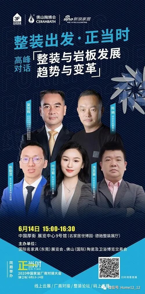 由国际名家具(东莞)展览会、佛山(国际)陶瓷及卫浴博览交易会联合举办的《整装出发·正当时——高峰对话:整装与岩板发展趋势与变革》,将于6月14日15:00-16:30,在中国厚街展览中心9号馆名家居世博园·德驰整装展厅,开启行业大咖巅峰对话。