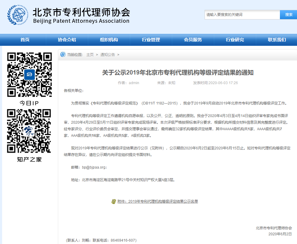 原标题:关于公示2019年北京市专利代理机构等级评定结果的通知