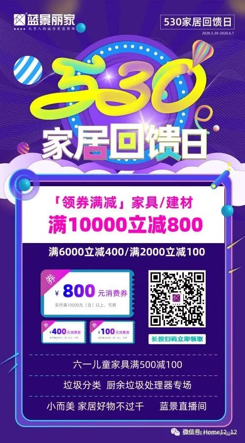 5月30日、31日,关注蓝景丽家官方微信公众号(微信号:lanjinglijia ),在导航栏最新活动中点击“领券连接”,可领取面值800元、400元、100元消费券。持券购物可享受满10000减800,满6000减400,满2000减100优惠活动。领券时间活动日11:00、14:00,数量有限,微信系统发完为止。