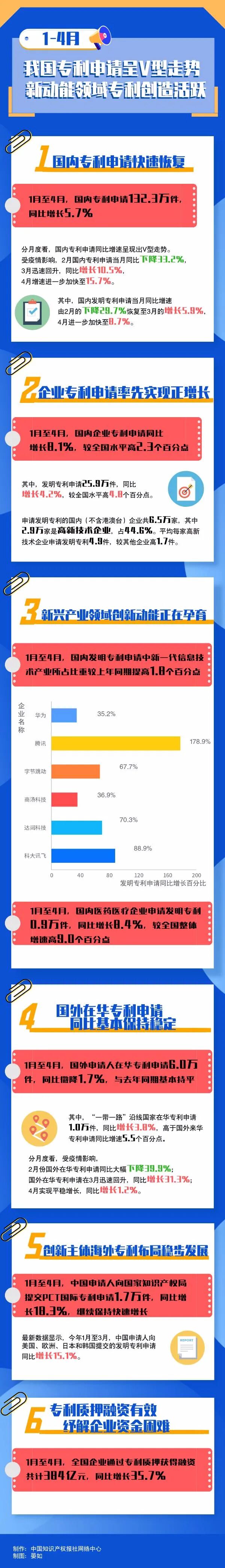 统计数据显示,今年前四个月,专利申请同比增速恢复到疫情前水平,高新技术企业成为企业申请的中坚力量,新动能领域企业专利申请增长迅猛,初步表明疫情加速市场主体转变发展理念、更加重视科技创新,创新驱动可能迎来进一步被激发的契机,坚定了我们依靠创新推动产业转型升级,促进经济高质量发展的信心与决心。详情请看下图: