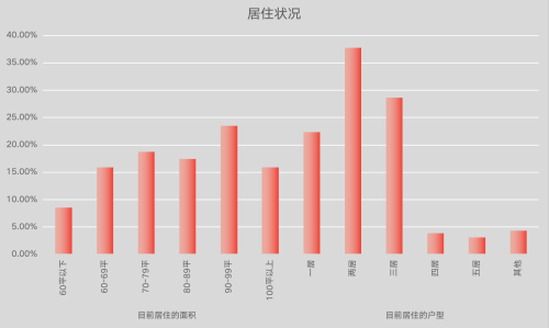从调查数据中能看出,绝大多数参与调查对象居住状况以两居室为主,同时三居、一居紧随其后,居住面积这一项中90平米左右居多,整体分布差距不大,值得关注的是,60平米以下比例在不断提升。