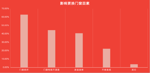 影响消费者更换门窗的因素中仍然有63%的人群会在门窗损坏时进行更换,而伴随着家庭装修和对门窗功能的需求而更换基本保持平衡,占总人群的40%左右。不过,有超过20%的消费者会因为门窗的美观度进行更换。