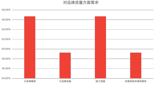 在装修过程中,对于品牌的需求层面,受调查对象中有60%以上的人群更加关注硬装品牌和施工质量。对于设备的品牌要求相对较低,而对于后期的质保及维修服务需求也在不断提升。其中,更加关注硬装的用户占22.22%左右,而近30%的人群更关注软装,两手都要抓,软装硬装都重视的用户占比则超过70%以上。