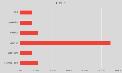 受调查人群中,企业职员占到了接近一半的49.53%,其次为私营业主和公务员及事业单位人员,分别占总调查人数的15.13%和12.42%。