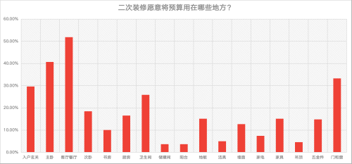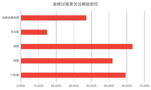 墙面、地面依然是消费者比较关心的装修部位,分别占63.26%和51.85%,不过值得关注的是,门窗的关注度甚至超过了地面,达到了59%。