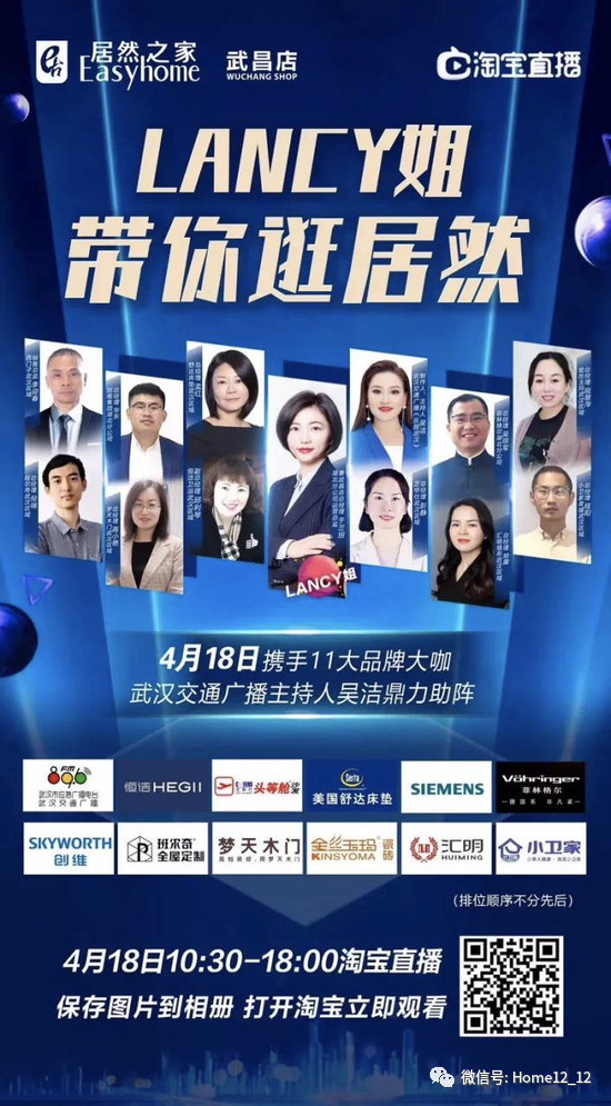 此外,4月18日,湖北家居界网红一姐:居然之家湖北分公司运营总监兼武昌店店长于兰田——Lancy姐带你逛居然第2季再度来袭, 10:30—18:00携手芝华仕头等舱沙发、舒达床垫、恒洁卫浴、西门子电器、菲林格尔地板、创维电器、班尔奇全屋定制、梦天木门、金丝玉玛瓷砖、汇明墙布、小卫家地砖美缝11大家居品牌大咖全天在线,同时知名节目主持人空降直播间,鼎力助阵,潮品限量购,红包雨不停…