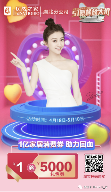 即日起至5月10日,登录居然之家淘宝官方旗舰店或者在居然之家汉口店、武昌店、光谷店、汉阳店四店淘宝直播间,1元就可抢购 “5000元家居消费券”礼包,同一用户只限一份;