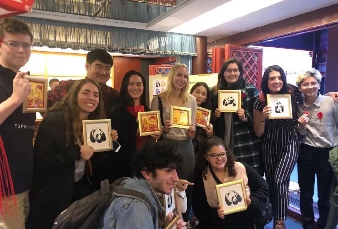 国际游学大会现场,众多国际旅行商代表热情观赏非遗项目剪纸