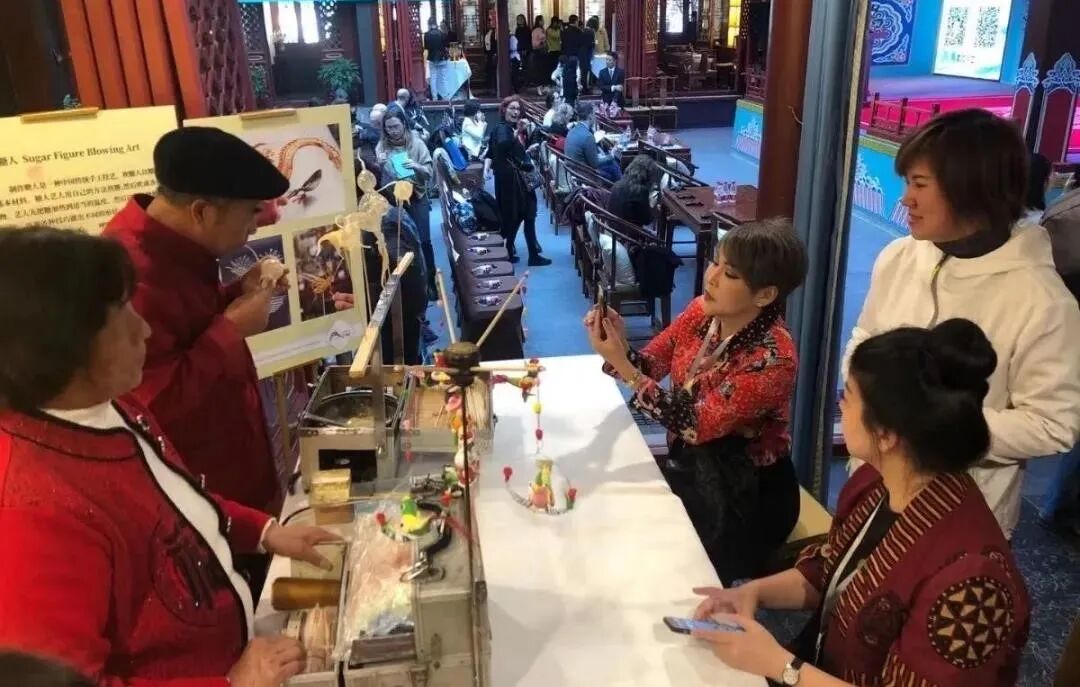 国际游学大会现场,众多国际旅行商代表体验吹糖人