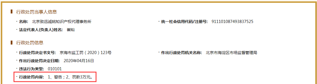 北京致远诚铭知识产权代理事务所因代理“火神山”等商标,罚款3万元