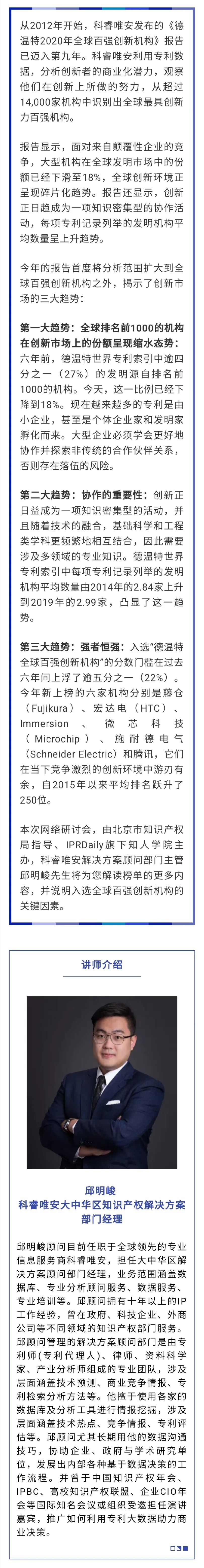 直播福利:凡参与直播的听众均可免费获得《德温特2020全球百强创新机构》中英文报告,同时也可以随时预约Derwent Innovation演示!数量有限,先到先得~