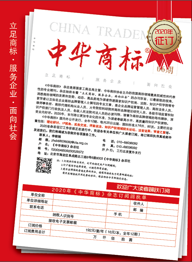 2020年《中华商标》杂志正火热征订中, 欢迎广大读者踊跃订阅↓↓↓