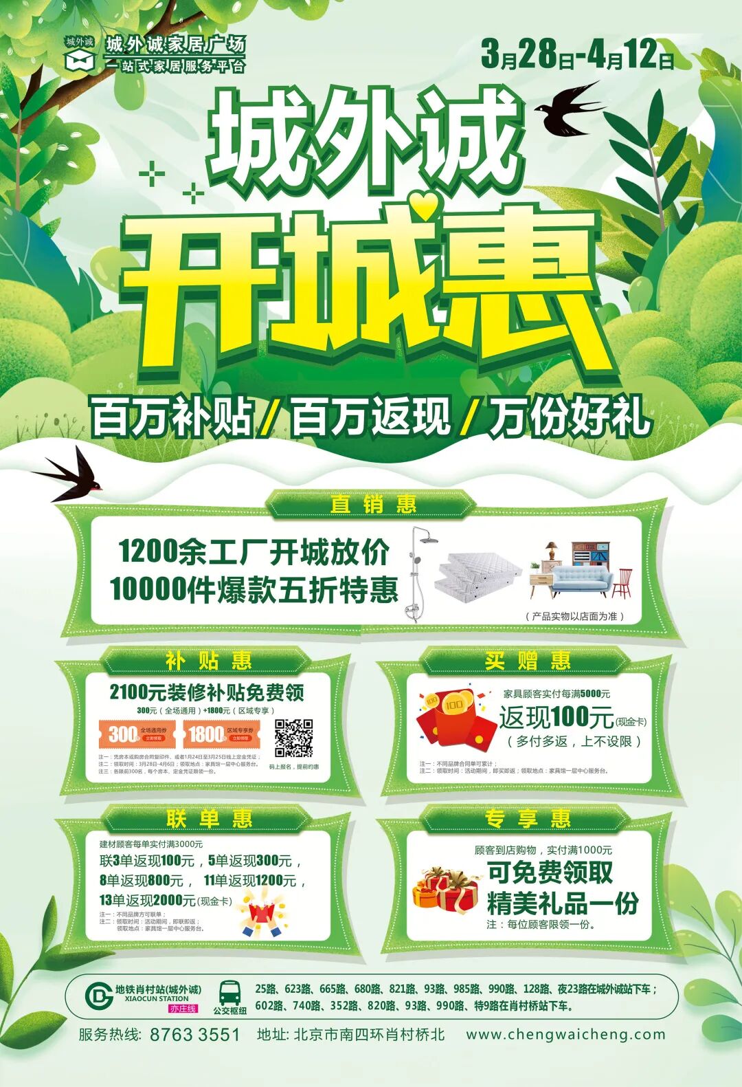 城外诚作为京城一站式家居购物平台,清明期间举办开“城”惠活动,整合卖场中的特价样品,让有紧急购物需求的顾客能够以实惠的价格、最快的速度买到心仪的产品。凭房本可领取2100元专属补贴;购物联单、满额享受100-2000元不等的返现特惠。