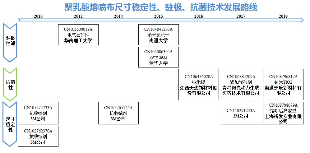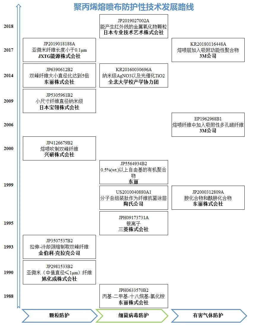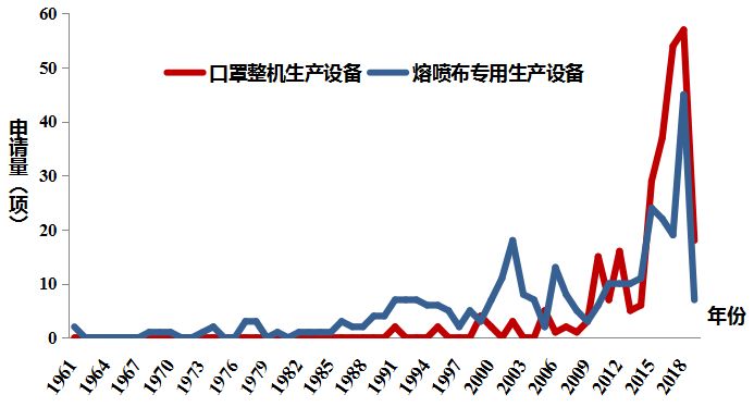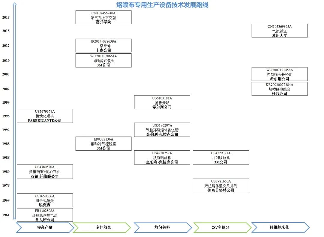 对于医用口罩生产设备,报告分析了口罩整机生产设备和熔喷布专用生产设备的专利申请情况,重点分析了熔喷布专用生产设备的核心部件——熔喷模头在提高产量、改良牵伸效果、均匀供料、双/多组分、纤维纳米化等方面的发展路线。