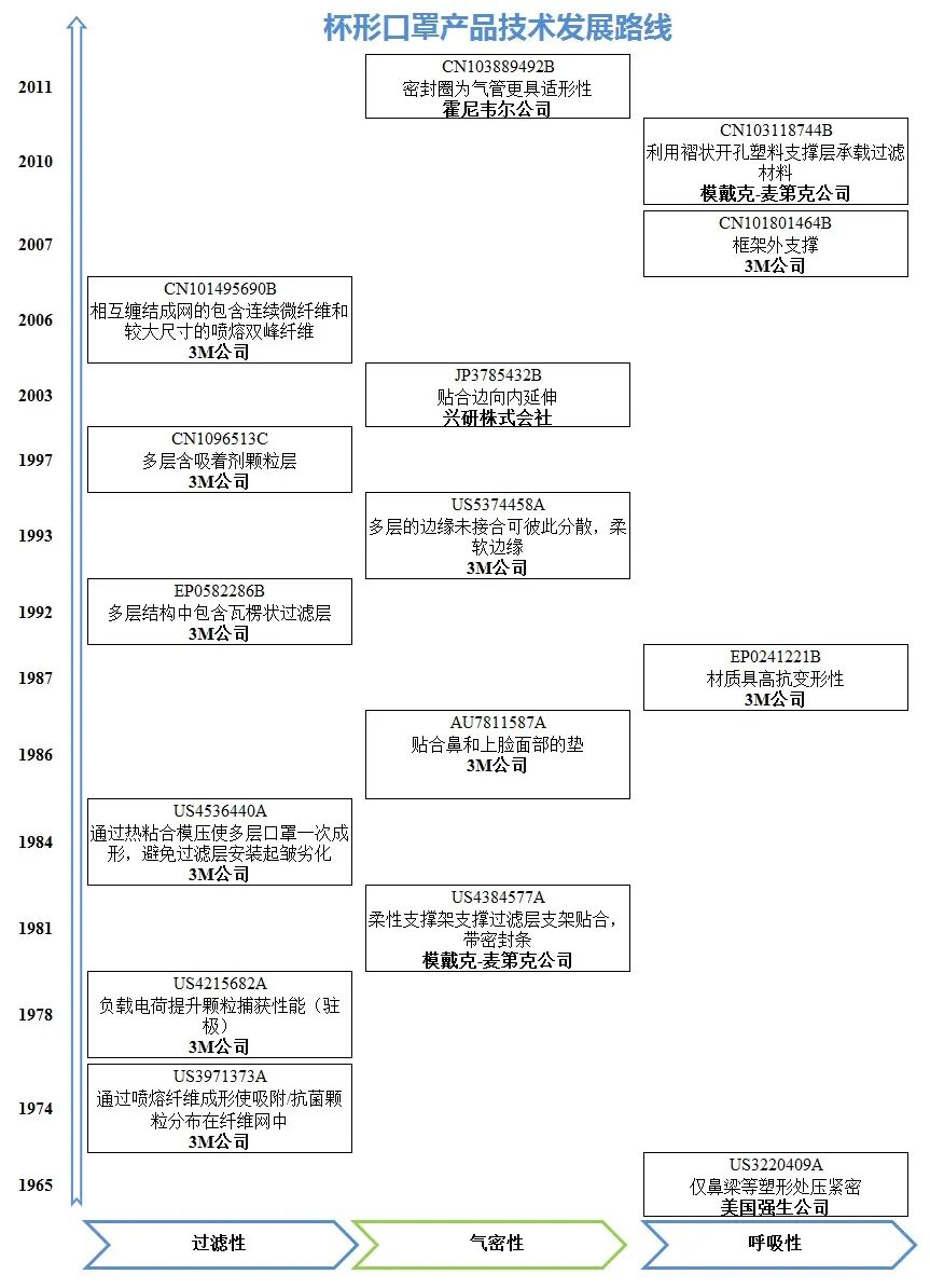 通过梳理立体口罩的杯形结构和折叠式结构的技术发展路线来看,主要研究方向集中在呼吸性、气密性的改进,实现呼吸性、气密性和过滤性三者的平衡。