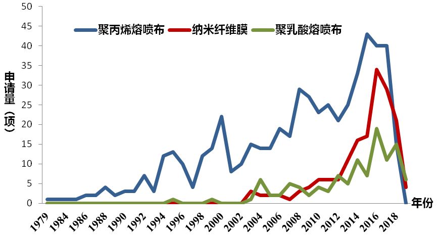 对于医用口罩关键原材料,三种关键原材料专利申请趋势基本趋同,聚丙烯熔喷布申请量最大。